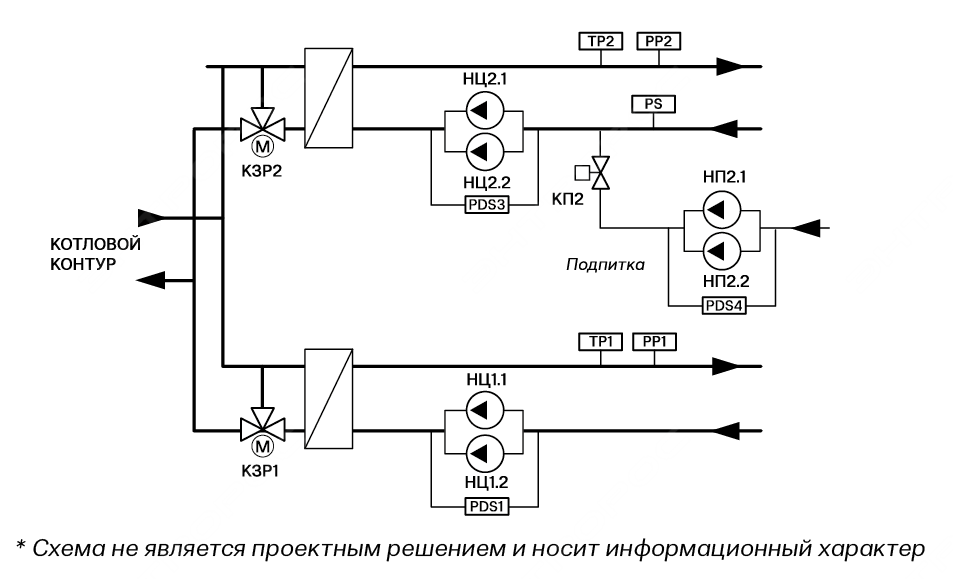 - управление подпиткой контуров с помощью подпиточных насосов и клапаном подпитки;